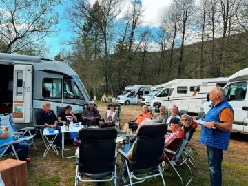 Ob aus Deutschland, Frankreich oder Italien – zahlreiche Wohnmobile aus verschiedenen Ländern finden sich hier auf dem Campsite ein. Die Fahrzeuge stehen ordentlich aufgereiht unter hohen Bäumen, während das Gelände mit Gras und Kies bedeckt ist. Dazwischen spazieren ganz entspannt Enten umher – als würden sie zu den Campern dazugehören.